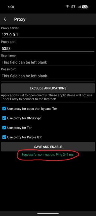Next go to the settings, tap "App mode" and set it to "Proxy (experimental)". Then tap "App mode" again and enable "SOCKS5 Proxy". Set the "SOCKS5 bind address" to 127.0.0.1:5353. Do NOT set a username and password.